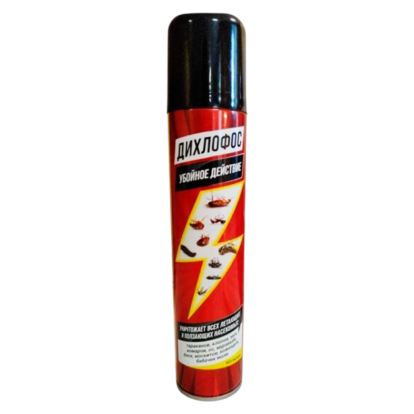 Средство Дихлофос Убойное действие для уничтожения в помещениях летающих и нелетающих насекомых: мух,комаров, москитов, бабочек моли, ос, а также тараканов, блох, клопов, муравьев и кожеедов.