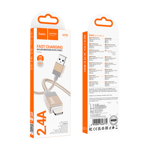 Кабель HOCO X110 USB (m)-Lightning (m) 1м 2.4A нейлон золотой (1/31/310)