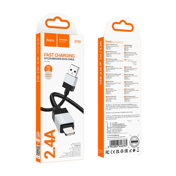 Кабель HOCO X110 USB (m)-Lightning (m) 1м 2.4A нейлон черный (1/31/310)