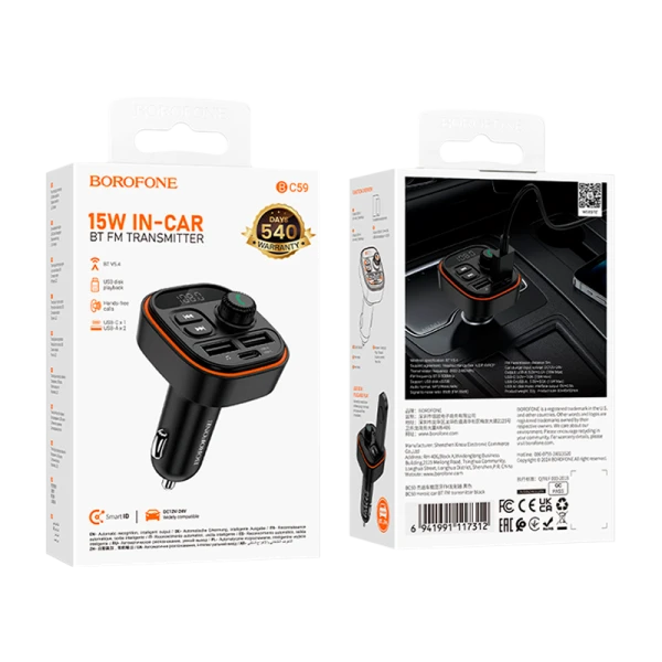 FM-трансмиттер Borofone BC59 2USB/Type-C bluetooth 5.4 дисплей черный (1/29/116)