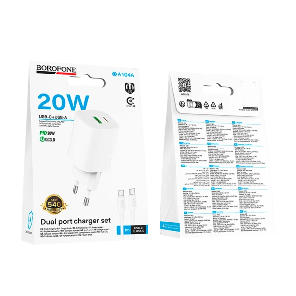Сетевое З/У Borofone BA104A 1USB+1Type-C 20W QC3.0 с кабелем Type-C/Type-C белый (1/20/120)