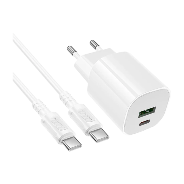 Сетевое З/У Borofone BA104A 1USB+1Type-C 20W QC3.0 с кабелем Type-C/Type-C белый цвет.