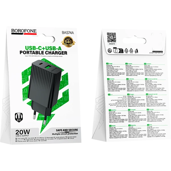 Сетевое З/У Borofone BAS74A 1USB+1Type-C 20W PD3.0 черный (1/20/120)