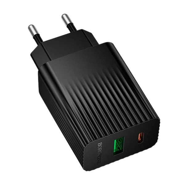 Универсальное сетевое зарядное устройство Borofone BAS74A черного цвета для электронной техники с двумя портами USB-A и Type-C подходит для быстрой зарядки одновременно двух устройств.