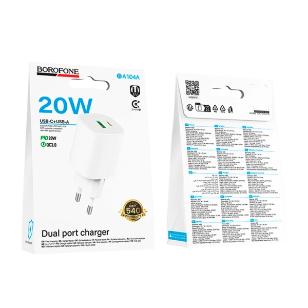 Сетевое З/У Borofone BA104A 1USB+1Type-C 20W QC3.0 белый (1/20/120)