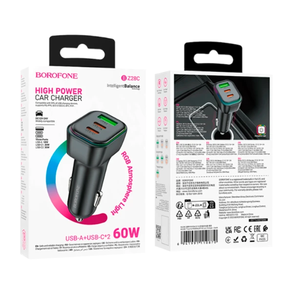 Автомобильное З/У Borofone BZ28 1USB+2Type-C 60W QC3.0 черный.