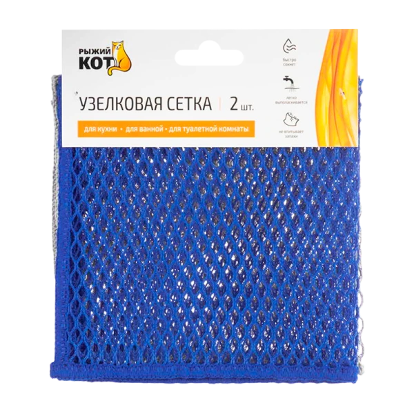 Узелковая сетка Рыжий кот 30х30см. Идеально подходит для мытья посуды, удаления жира, ухода за сантехникой. Заменяет губку и металлическую мочалку, не впитывает запахи, быстро сохнет, не царапает поверхность. Для кухни, ванной, туалетной комнаты.
