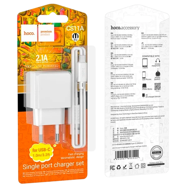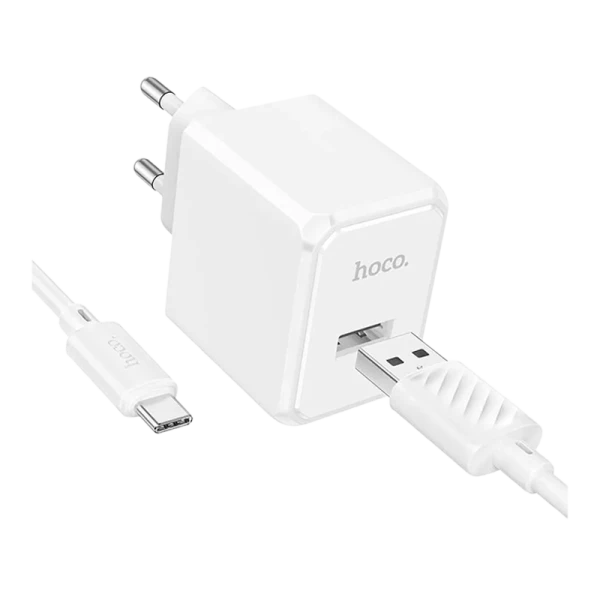 HOCO CS11A - сетевое зарядное устройство с одним USB портом, комплект с кабелем Type-C белого цвета, выходной ток 2,1А.