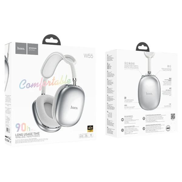 HOCO W55 — стильные беспроводные полноразмерные наушники для использования с ТВ, аудио, видео техникой, компьютером, телефоном или ноутбуком, обеспечивают беспроводную связь через версию Bluetooth 5.4. Наушники HOCO W55 оснащены удобными, мягкими амбушюрами, в которых не чувствуется дискомфорт даже при длительном использовании. Гарнитура оснащена слотом для карты памяти, что дает возможность сделать из наушников аудиоплеер mp3. Устройство имеет емкость батареи: 800mAh, время работы в режиме использования составляет 90 часов, в режиме ожидания до 200 часов. Полная зарядка батареи займет около двух часов. Имеет два языка уведомлений - английский и китайский.