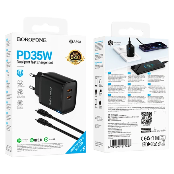 Сетевое З/У Borofone BA85A 2Type-C 3.0A 35W QC3.0 с кабелем Type-C/Type-C черный цвет.