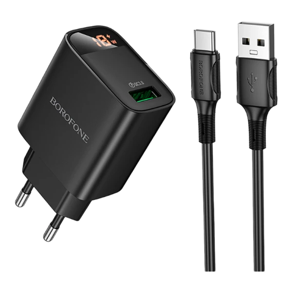 Сетевое З/У Borofone BA95A 1USB 18W QC3.0 дисплей с кабелем Type-C черный (1/46/184)