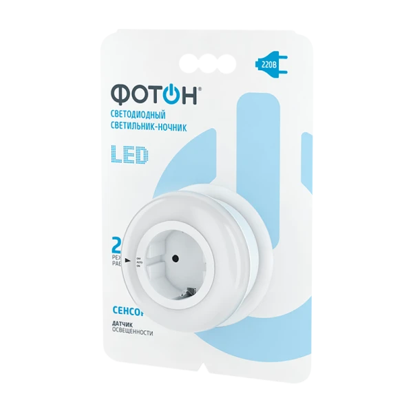 Многофункциональный сетевой светильник-ночник ФОТОН не только служит ночником с двумя режимами работы, но и оставляет розетку свободной для подключения других устройств. Уютный тёплый свет создают светодиоды с цветовой температурой 2700К. Мягкая подсветка не слепит глаза благодаря использованию современных рассеивающих материалов. Свободная розетка с защитными шторками. 2 режима включения: ночник включается вручную или автоматически при наступлении темноты. Фронтальное освещение (перед собой).
