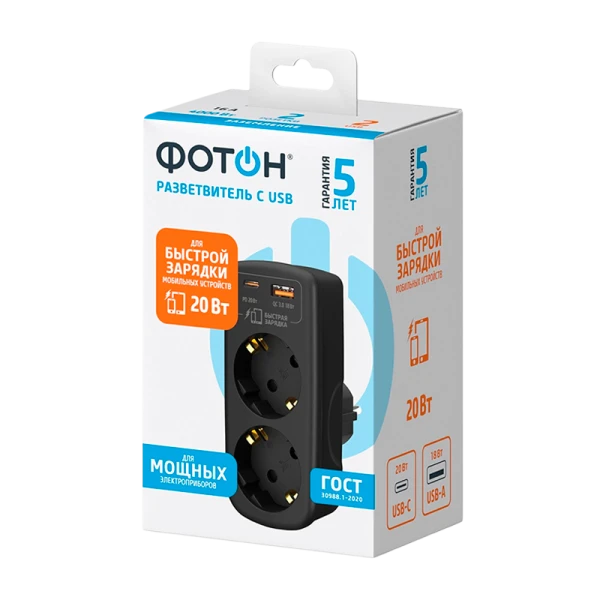 Сетево1 разветвитель «ФОТОН» с двумя разъёмами USB (Type-A, Type-C) — идеальное решение для тех, кто ценит порядок и экономию времени. Благодаря функции быстрой зарядки, разветвители «ФОТОН» значительно сокращают время зарядки мобильных устройств и другой электроники. Мощность каждого разъёма составляет от 18 до 20 Вт, обеспечивая высокую скорость зарядки. При подключении устройств к разветвителю USB для быстрой зарядки, происходит обмен информацией для установки оптимального режима зарядки.