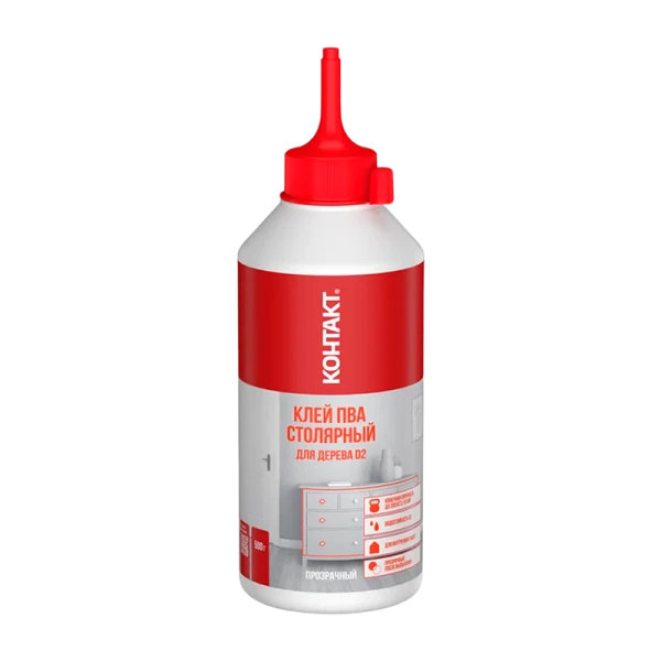 Клей ПВА Контакт столярный для дерева D2 на основе водной дисперсии ПВА образует прочный, водостойкий и прозрачный клеевой шов при склеивании различных пород дерева и материалов на его основе. Клеевое соединение D2 эксплуатируется преимущественно внутри помещений. Используется для судомоделирования, ремонта мебели и других деревянных изделий, не имеющих постоянного контакта с влажной средой.