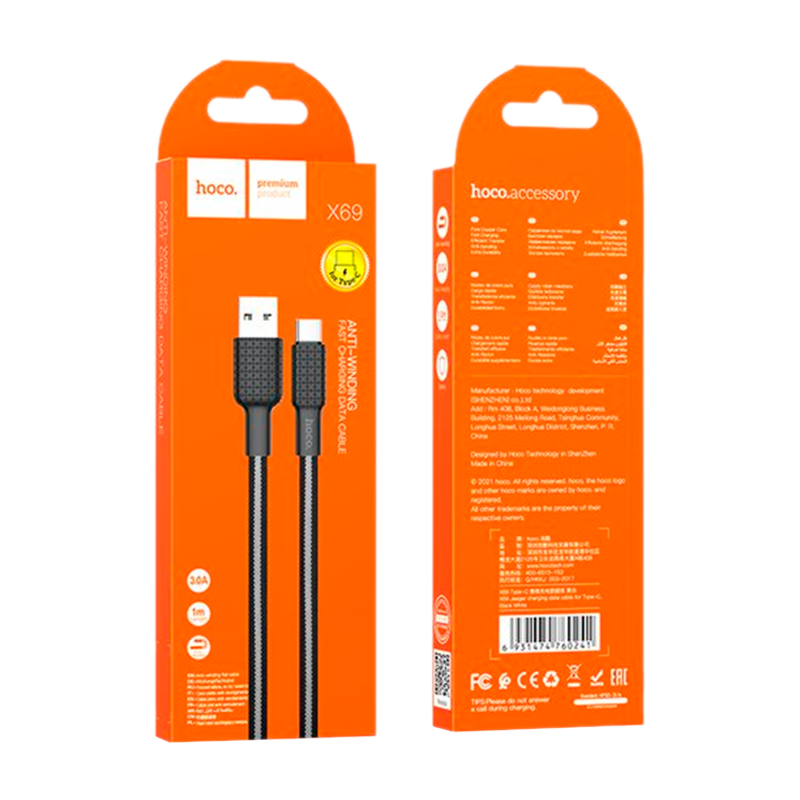 Кабель HOCO X69 USB (m)-Type-C (m) 1м 3.0A нейлон черный белый (1/33/330)