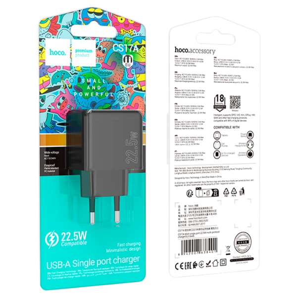 Зарядное устройство HOCO CS17A с одним портом USB-A мощностью 22.5W для быстрой и эффективной зарядки ваших устройств. Устройство обеспечивает быструю зарядку смартфонов, планшетов и других гаджетов от ведущих производителей. Для максимальной эффективности рекомендуется использовать с кабелем типа A-C с поддержкой тока 3А. Компактный размер и надежная конструкция делают это зарядное устройство идеальным выбором для дома, офиса и путешествий. Материал корпуса HOCO CS17A: прочный ABS-пластик.