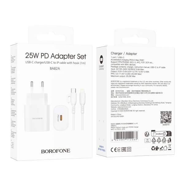 Сетевое З/У Borofone BA82A Type-C 3.0A 25W PD,QC с кабелем Type-C-Lightning белый (1/46/184)
