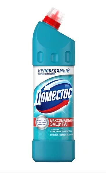 Дезинфицирующие средства Доместос, в составе которых есть мощный антисептик гипохлорит натрия максимально очищают поверхности и убивают 100 % известных вирусов, бактерий, плесени, спор и других видов микробов (по результатам инструментальных тестов Unilever). Domestos предотвращает распространение эпидемий в период активности вирусов благодаря поддержанию гигиены. Средство универсальное Domestos Свежесть Атлантики, 500 мл поможет избавиться от неприятных запахов в доме. Чистящий гель имеет густую текстуру и равномерно распределяется по поверхности, не оставляя разводов. Благодаря дезинфицирующей формуле с натрия гипохлоритом и оптимальному количеству дезинфектанта наши cleaners-продукты эффективно уничтожают вирусы, споры, грибки, бактерии и микробы. Его можно использовать не только для гигиены ванной комнаты и туалета, но и для очистки всех рабочих поверхностей, дезинфекции полов и кафеля.