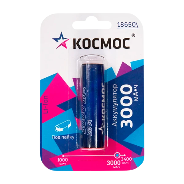 Аккумулятор Li-ion Космос 18650 BL1 3000mAh б/з с выводами (1/100)
