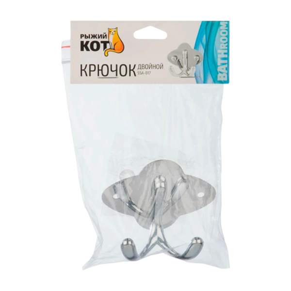 Крючок двойной Рыжий кот SSA-017 изготовлен из нержавеющей стали. Изделие крепится к стене с помощью дюбелей и саморезов (входят в комплект). Предназначена для ванной комнаты или сауны, для размещения полотенец, халатов и другой текстильной продукции.