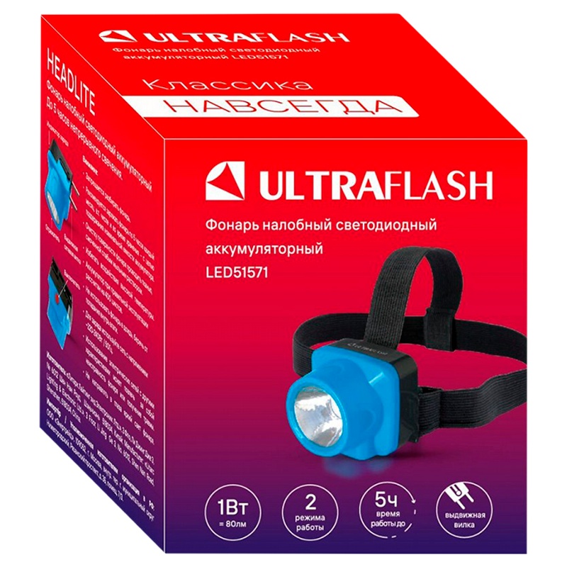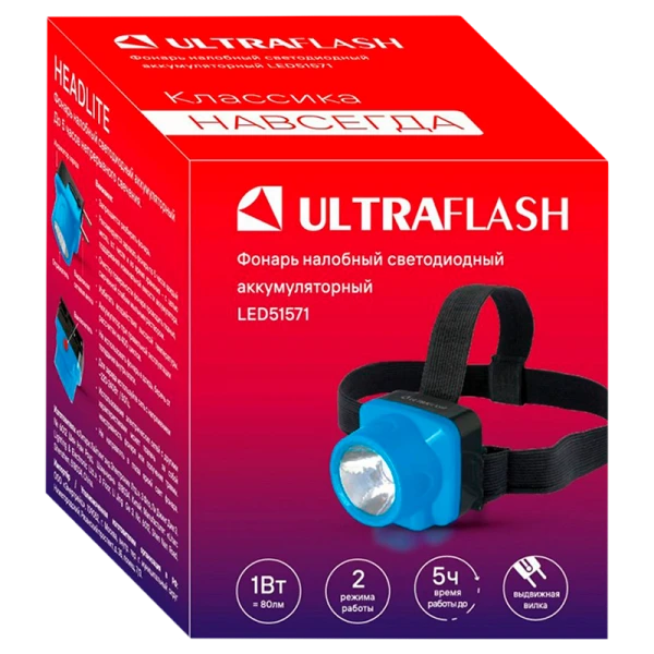 Фонарь налобный Ultraflash LED51571 1W LED от аккумулятора IP43 2 режима голубой (1/20/180)