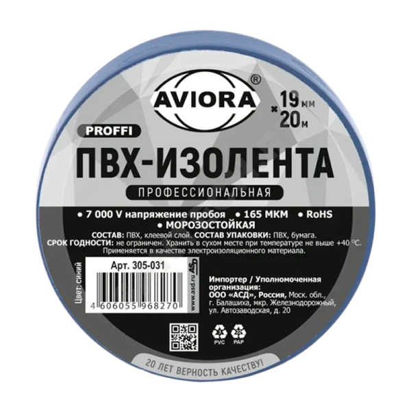 Изолента Aviora ПРОФЕССИОНАЛЬНАЯ 19мм*20м ПВХ 165мкм синий (1/10/100)
