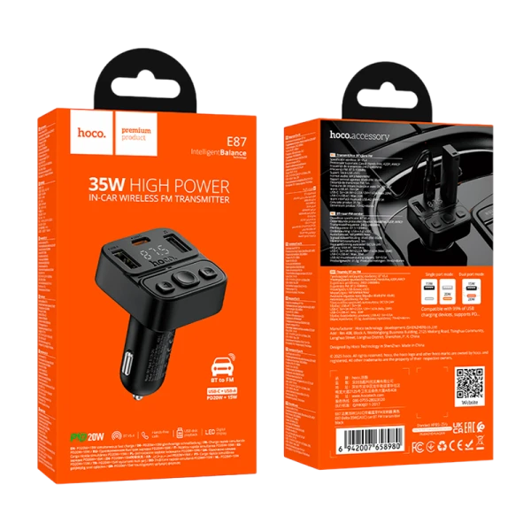 FM-трансмиттер HOCO E87 2USB+Type-C bluetooth 5.4 дисплей черный (1/120)