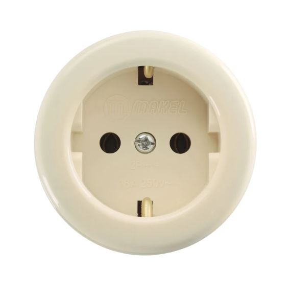 Розетка круглая накладная с заземлением Makel 16011 имеет заземление и используется в составе открытой проводки. Монтаж производится без применения подрозетника. Розетка предназначена для обеспечения питания электроприборов путем их подключения к сети. Корпус округлой формы, изготовлен из высокопрочного пластика на основе поликарбоната. Цвет изделия - кремовый.