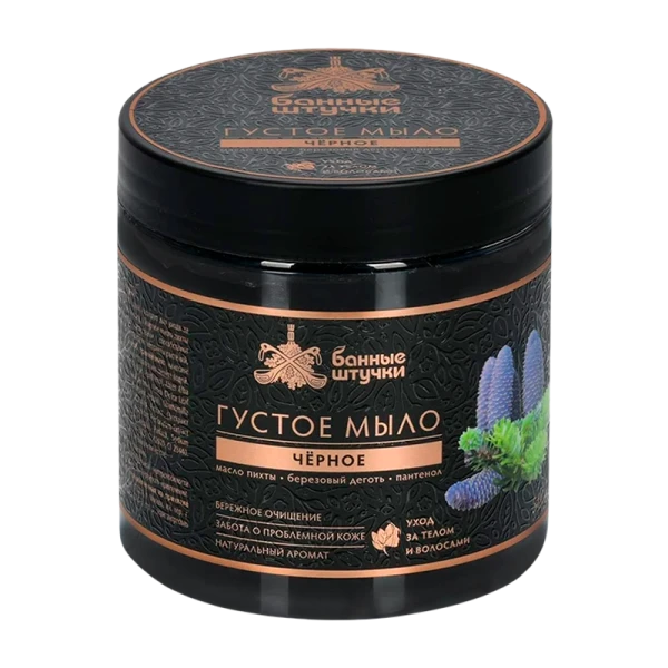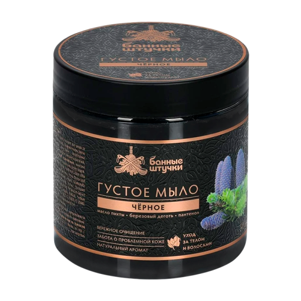 Густое черное мыло Банные штучки прекрасно сочетает в себе свойства шампуня и геля для душа. Оно подходит для ухода за телом и волосами. Входящие в состав эфирное масло пихты и березовый деготь обладают противовоспалительными и восстанавливающими свойствами, способствуют нормализации работы сальных желез, а пантенол помогает увлажнить и смягчить кожу. Черное мыло также содержит экстракты растений, благоприятно воздействующие на кожу и волосы.