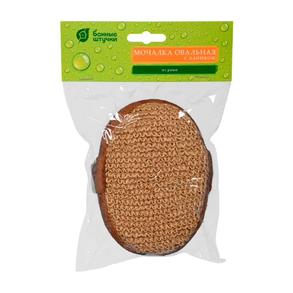 Мочалка для тела Банные штучки предназначена для ежедневного использования. Изготовлена из рами, хлопка, поролона, гипоаллергенная. Мочалка для тела овальная мягко отшелушивает кожу, не повреждая её. Для удобного мытья изделие имеет ручку.