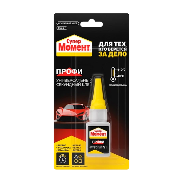 Клей Момент СуперМомент Профи - универсальный секундный клей высокой чистоты низкой вязкости. Идеально подходит для работы с трудно склеиваемыми пластиками и резинами, такими как: натуральный каучук, этилен-пропилен-диен-каучук и бутилкаучук.