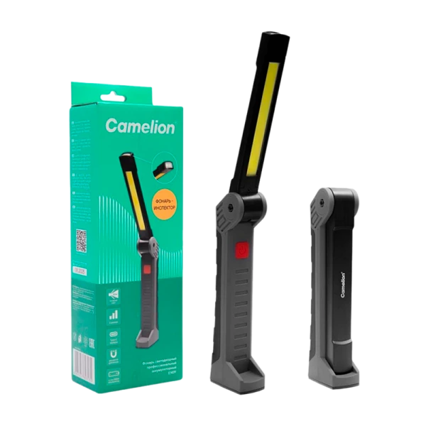 Фонарь Camelion E1439 светодиодный аккумуляторный универсальный с для проведения осмотровой работы. Поворотный плафон с 3 режимами работы, Заряд Type-C. Магнит для крепления к металлической поверхности, петля для подвеса.