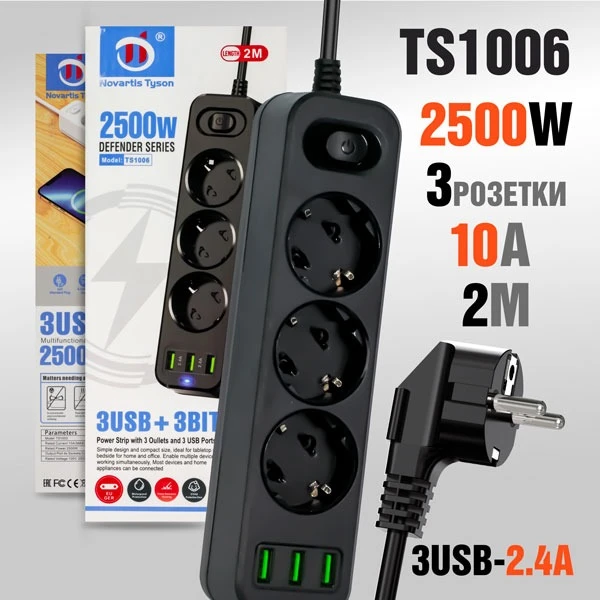 Сетевой фильтр Live Power TS1006 3р.С/З 10A 2.0м 3USB с выкл. черный