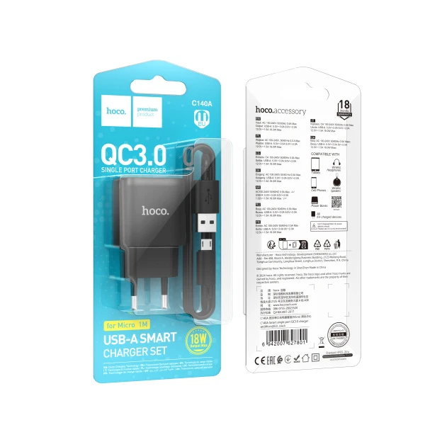 Сетевое З/У HOCO C140A 1USB 2.1A 18W QC3.0 с кабелем microUSB черный (1/28/168)