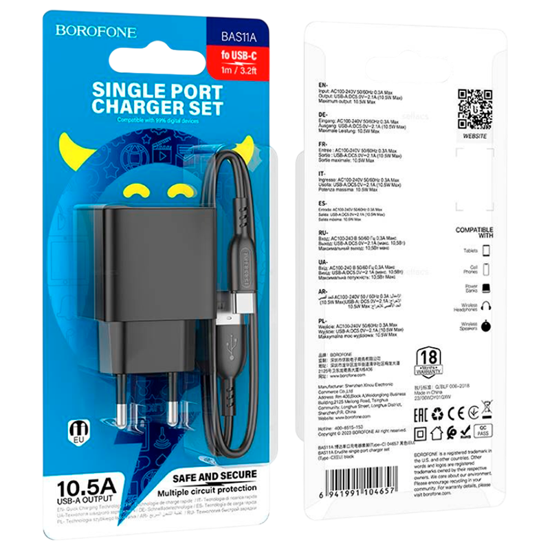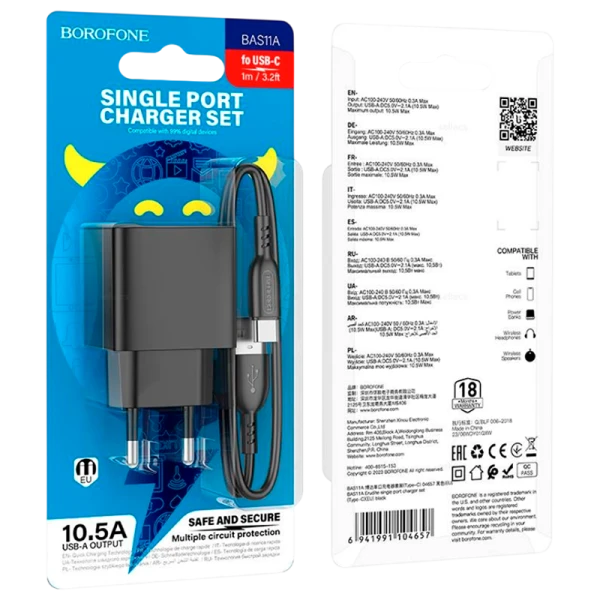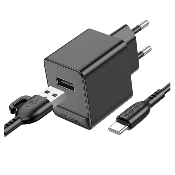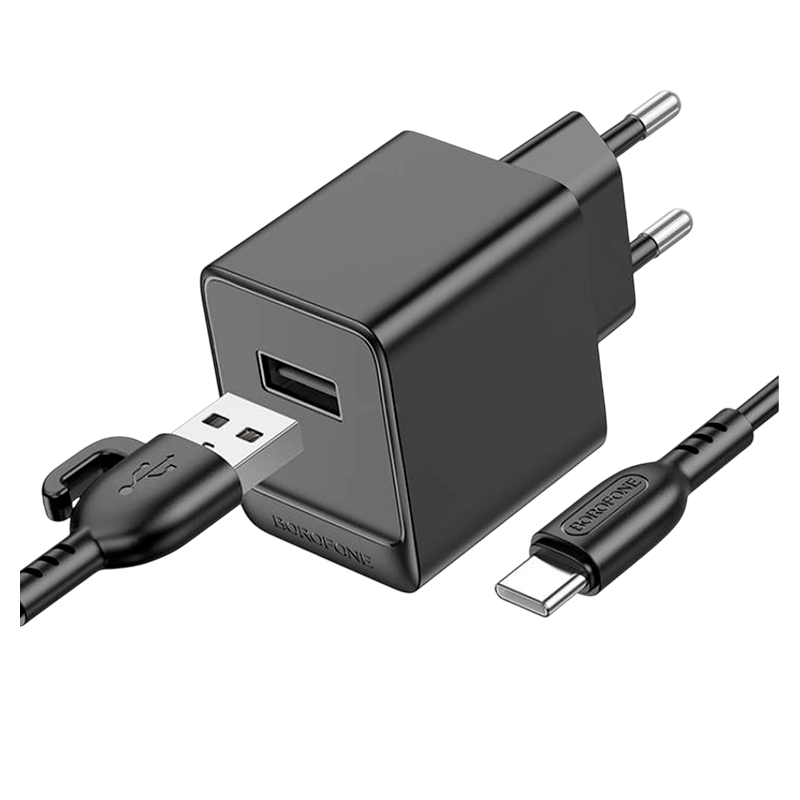 BOROFONE BAS11A, сетевое зарядное устройство, выход USB 5V/2.1A, вилка EU, набор с кабелем для Type-C.