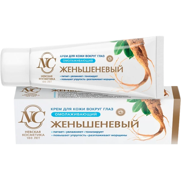 Крем для кожи вокруг глаз омолаживающий «Невская Косметика Женьшеневый». Крем однородной текстуры от белого до кремового цвета с легким травяным запахом. Сокращает глубину и количество морщин, улучшает внешний вид кожи, повышает упругость, питает и увлажняет, тонизирует. Кожа становится эластичной, упругой и хорошо увлажненной, приобретает здоровый, ровный цвет, сокращаются глубина и количество морщин.