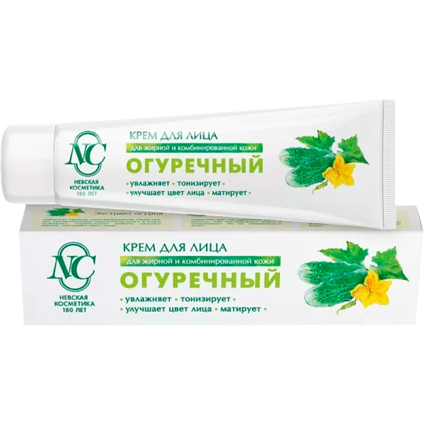 Крем для лица Невская Косметика Огуречный разработан как средство по уходу за склонной к жирности кожей, а также за кожей с выраженной Т-зоной. Он содержит натуральный огуречный экстракт (сок огурца) и увлажняющий компонент на основе глюкозы, благодаря чему активно увлажняет и тонизирует кожу, улучшает цвет лица и нормализует работу сальных желез. Оказывает легкое матирующее действие, а благодаря своей легкой консистенции, он быстро впитывается, оставляя приятное ощущение свежести и комфорта.