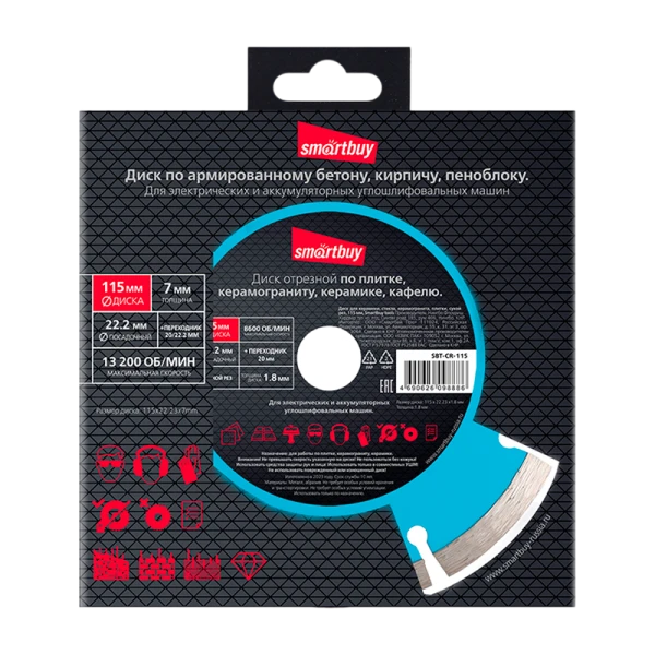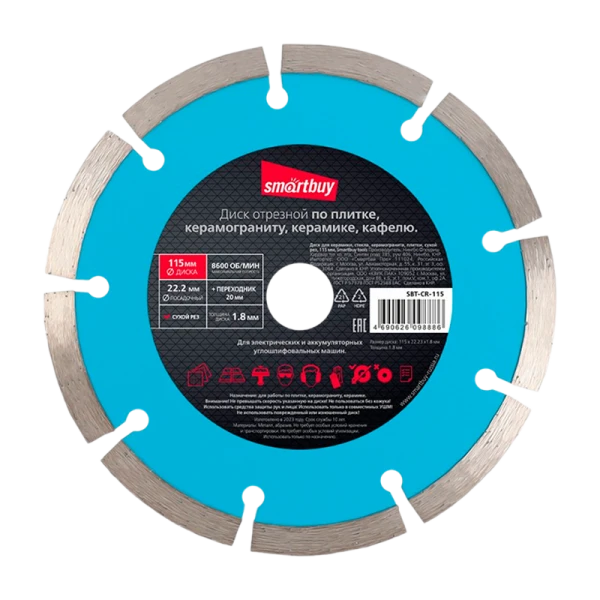 Алмазный диск от бренда Smartbuy - это надежный инструмент для работы с армированным бетоном, железобетоном, кирпичом и заливным полом. Благодаря диаметру 115 мм и посадке 22.3 мм, он совместим с большинством болгарок и штроборезов. Отличный выбор для профессионалов и любителей.