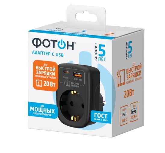 Сетевой адаптер ФОТОН AM 16-1E-USB/A1C1-QC чёрного цвета с заземлением – это универсальное решение для одновременного подключения бытовых приборов и быстрой зарядки мобильных устройств. Оснащен одной розеткой (до 16А/4000Вт), портом USB-A с Quick Charge 3.0 (18 Вт) и USB-C с Power Delivery (20 Вт), что позволяет максимально быстро заряжать смартфоны, планшеты и другую электронику. Негорючий ударопрочный корпус и латунная контактная группа обеспечивают безопасность и долговечность. Соответствует ГОСТ, имеет степень защиты IP20 и 5-летнюю гарантию, гарантируя надежность в повседневном использовании.