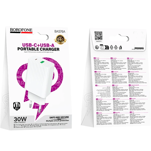 Универсальное сетевое зарядное устройство Borofone BAS74A, белый цвет для электронной техники с двумя портами USB-A и Type-C подходит для быстрой зарядки одновременно двух устройств.