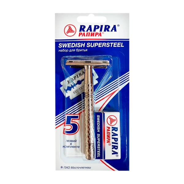 Классические лезвия для бритья Рапира Суперсталь покрываются хромо-платиновым и тефлоновым слоями, что обеспечивает комфорт при бритье. Головка и ручка бритвенного станка выполнена из металла.