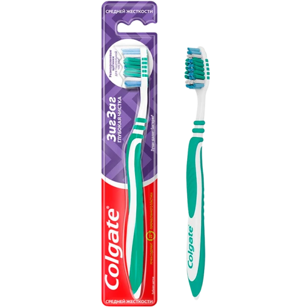 Зубная щетка Colgate Зигзаг, средняя. Уникальной особенностью щетки для зубов от Colgate являются перекрещивающиеся щетинки средней жесткости, предназначенные для глубокой и эффективной чистки межзубных промежутков. Удлиненные кончики щетинок позволяют удалять налет с задних зубов, наиболее подверженных кариесу.