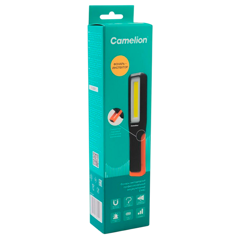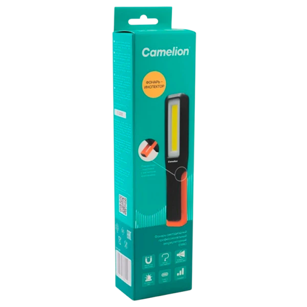 Фонарь Camelion E1440 светодиодный аккумуляторный универсальный с для проведения осмотровой работы. 3 режима работы, Магнит для крепления к металлической поверхности, крючок, поворотная подставка.