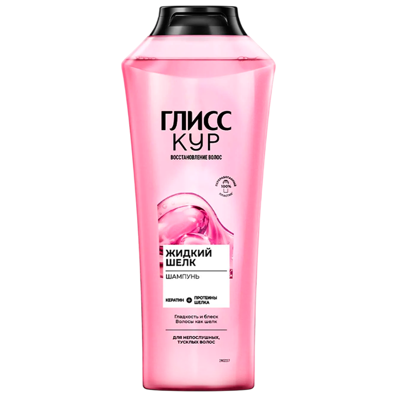 Шампунь Глисс Кур Жидкий Шелк 400мл. Из-за повреждений волосы становятся непослушными и теряют блеск. Чтобы вернуть им гладкость и шелковистость нужен особый уход за волосами. Шампунь для волос ГЛИСС КУР Жидкий Шелк обеспечивает: эффективное очищение, мягкость волос и блеск, волосы как шелк. Продукт содержит 91% ингредиентов натурального происхождения (включая воду).