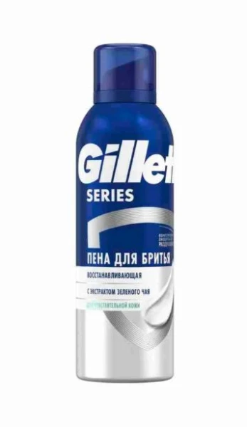 Мужская пена для бритья Gillette Series восстанавливающая бережно воздействует на кожу обеспечивая комфортное бритье. Преимущества: - В составе пены содержится эестракт зеленого чая, который восстанавливает кожу во время бритья - Gillette Series обеспечивает гладкое бритье и дарит ощущение мягкости. - Пена для бритья Gillette Series легко пенится и смывается под проточной водой. - Благодаря воздушной и густой структуре пена способствует легкому скольжению бритвы по коже и защищает кожу во время бритья. - Не содержит красителей и спирта. - Пена имеет легкий и освежающий аромат.