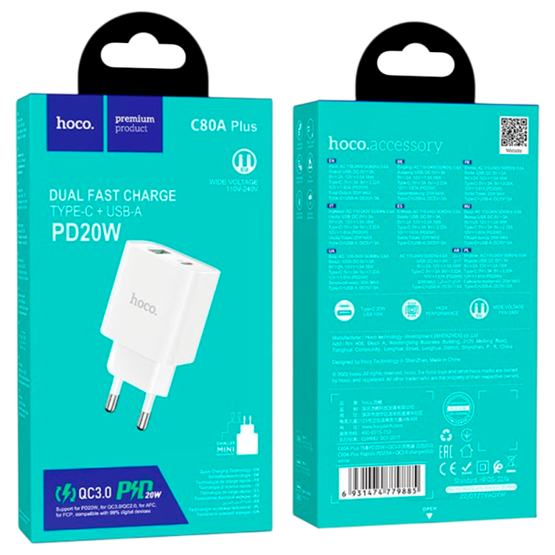 Сетевое зарядное устройство HOCO C80A оснащено выходами USB мощностью 18W и Type-C мощностью 20W. Поддерживает протоколы быстрой зарядки PD20W, QC3.0/QC2.0, PPS, AFC и другие. Подходит для зарядки смартфонов и других мобильных устройств. Блок для зарядки имеет защиту от замыкания и оснащен интеллектуальной системой идентификации, которая распознает заряжаемое устройство и выдает подходящие для него параметры зарядки. Корпус изготовлен из огнестойкого поликарбоната. Размеры – 78х43х27 мм, вес – 44 гр.