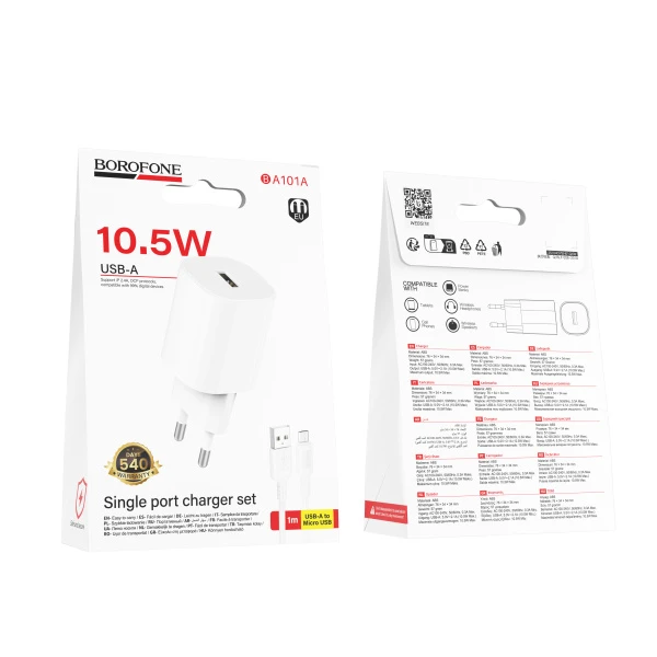 Сетевое З/У Borofone BA101A 1USB 2.1A 10.5W с кабелем microUSB белый (1/20/120)