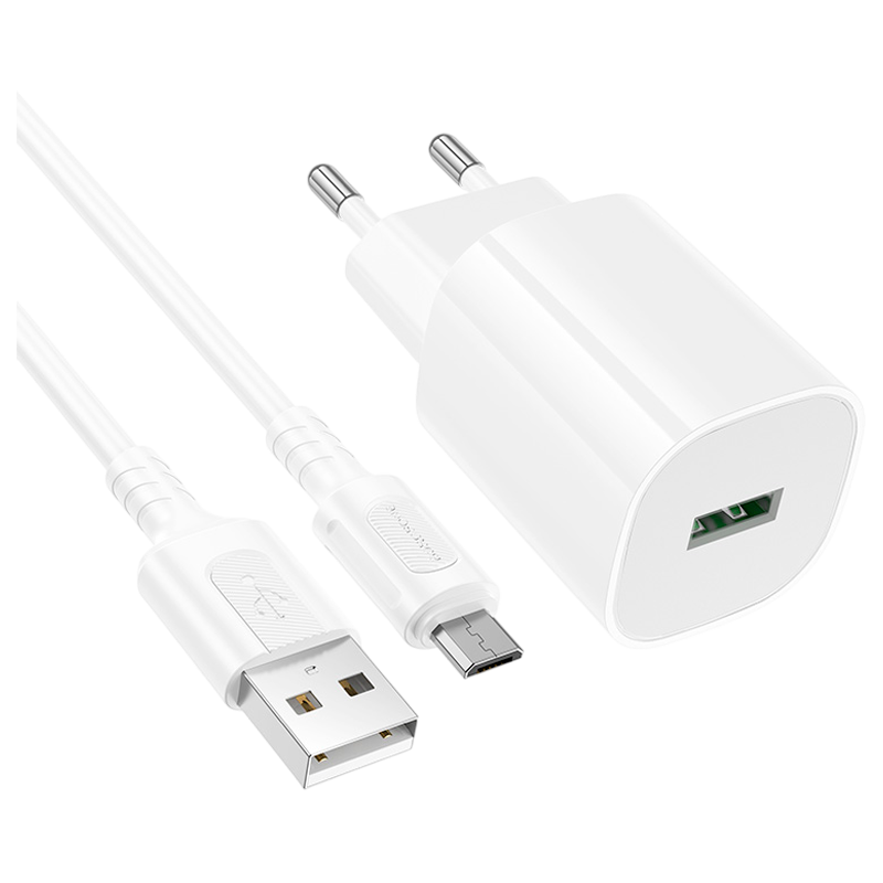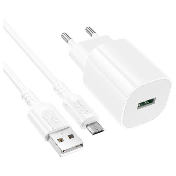 Сетевое З/У Borofone BA102A 1USB 18W QC3.0 с кабелем microUSB, белый цвет.