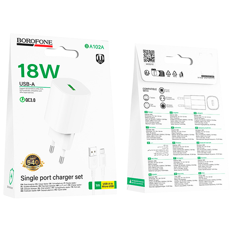 Сетевое З/У Borofone BA102A 1USB 18W QC3.0 с кабелем microUSB белый (1/20/120)