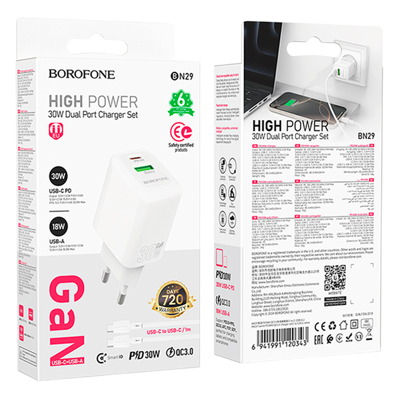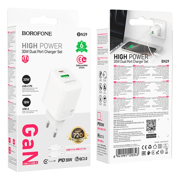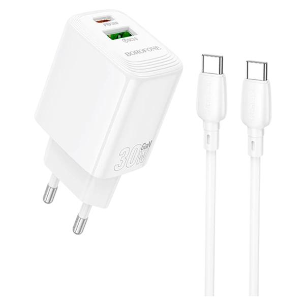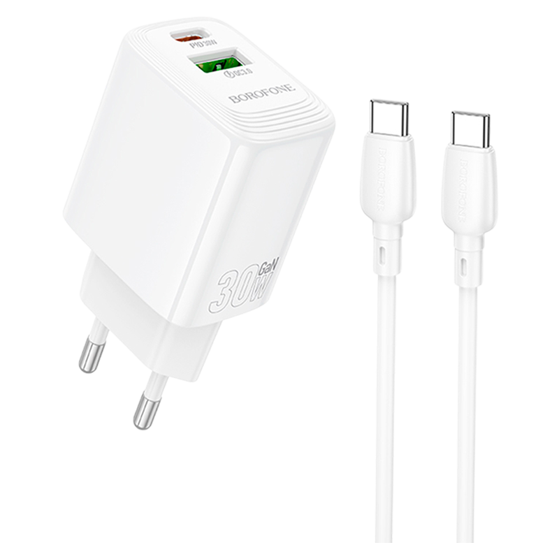 Сетевое З/У Borofone BN29 1USB+1Type-C 3.0A PD,QC GaN белый (1/32/128)